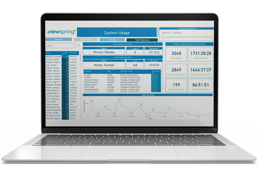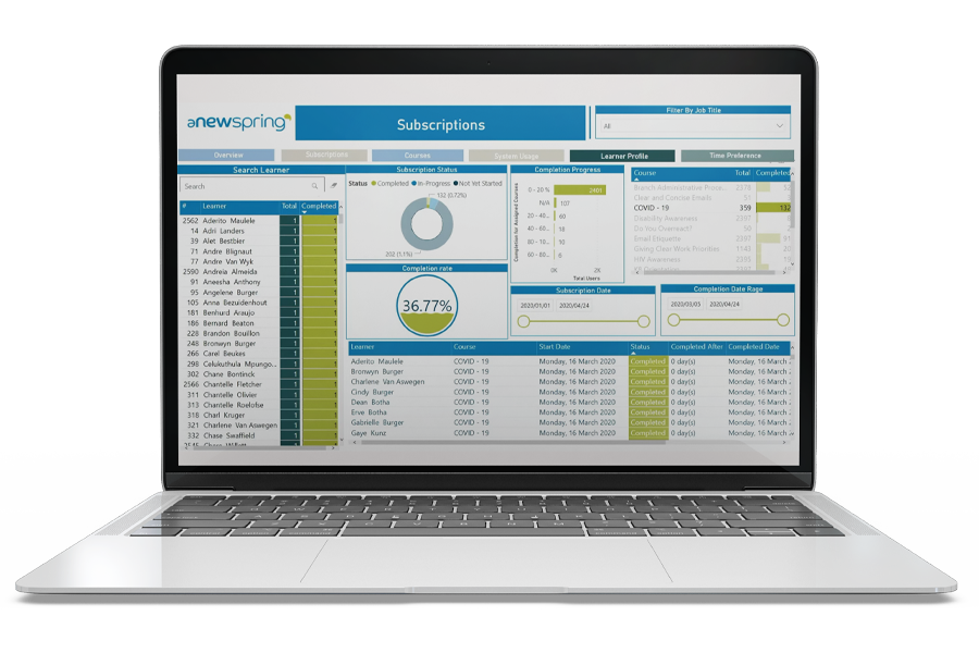Access to the dashboard is directly through aNewSpring. New Leaf Technologies embeds it as a course tile. All users have to do is click on it, and they’re able to view insights in real-time with the look and feel of the dashboards differing from customer to customer. The dashboards can be completely in line with varying corporate brand guidelines and other specific wishes.