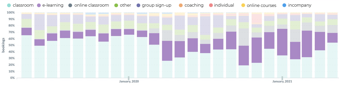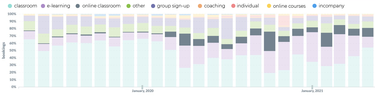 Every month, around 15% to 25% of all registrations are for learning products that take place online.