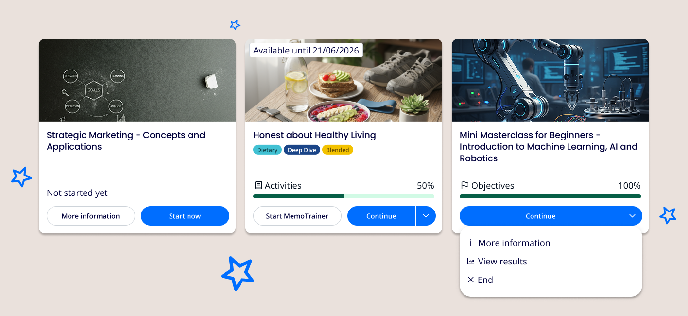 One progress bar: The tile no longer shows three progress bars. Instead, it displays only the most relevant one, depending on what matters most: activities, learning objectives, or retention.