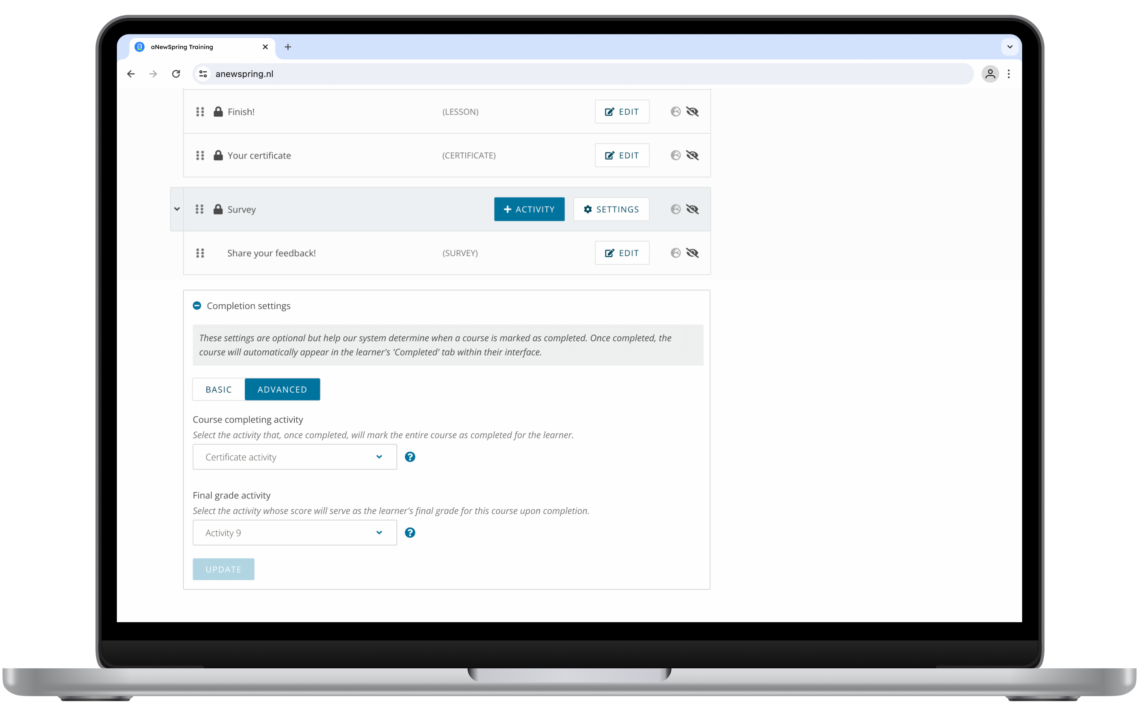 Now this moment will also have meaning within our interface. As soon as the Course Completing Activity is completed by the learner, their course will move from the tab ‘in progress’ to the tab ‘completed’.