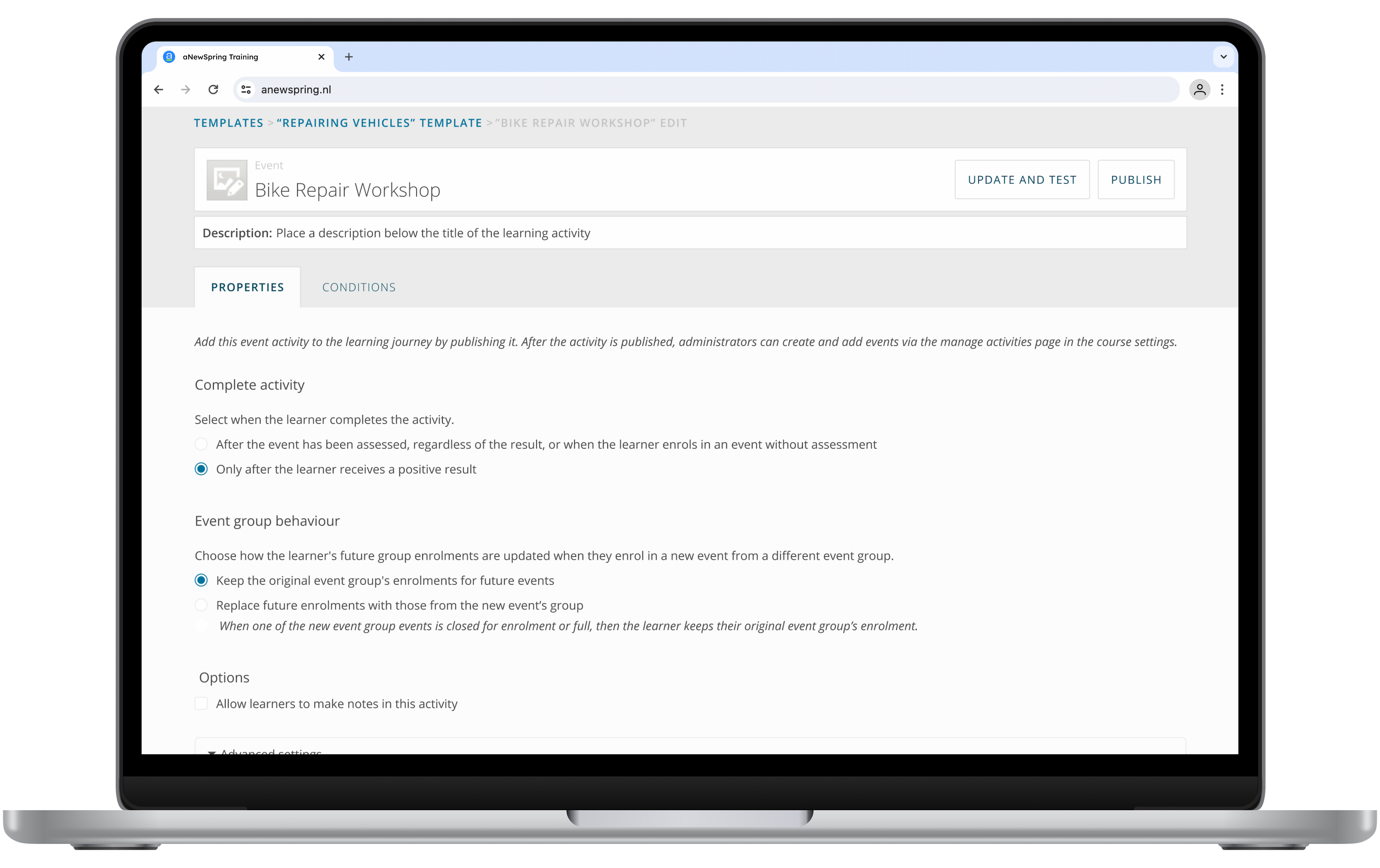 With the new ‘complete activity’ setting for Event activities you can make this happen! By saying that the learner only completes the activity after receiving a positive assessment, the learner is able to enroll into another event after receiving a ‘negative assessment’. Giving them a second (or even a third or fourth) chance to be present and to learn.