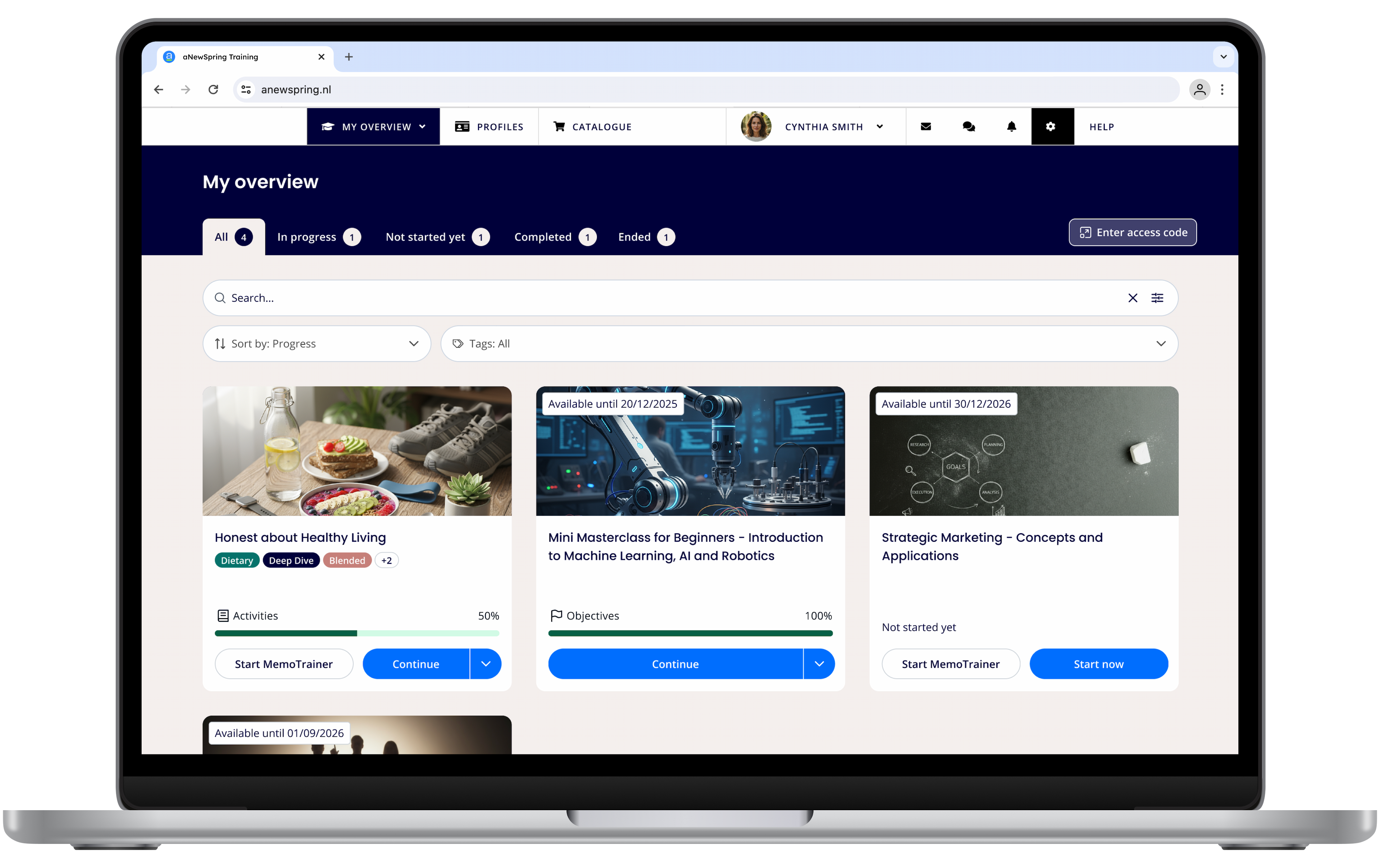 The biggest change is the different tabs on top of the page. Learners can choose to see all courses or only the courses that are in a specific status: in progress, not started yet, completed or ended.