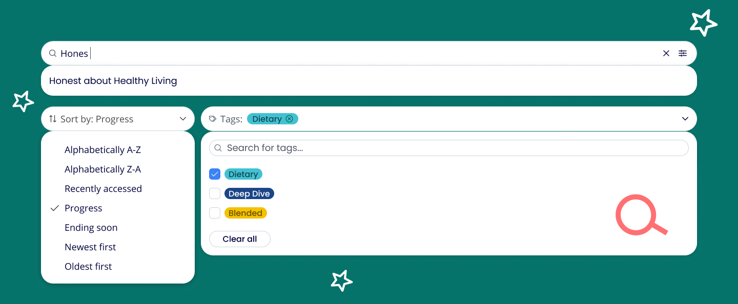 Learners have three interactions to more easily find or organise the courses on their overview: searching, sorting and filtering based on tags.