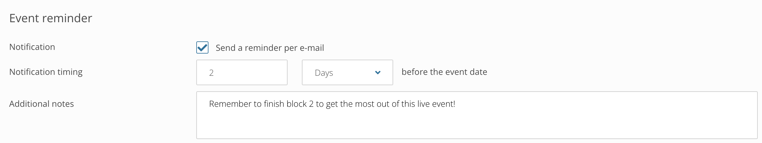 With the new reminder email for events, you can now send an automatic reminder to learners and instructors a few days in advance. You can adjust the exact number of days for each event, and also add a note to be included in the reminder email.