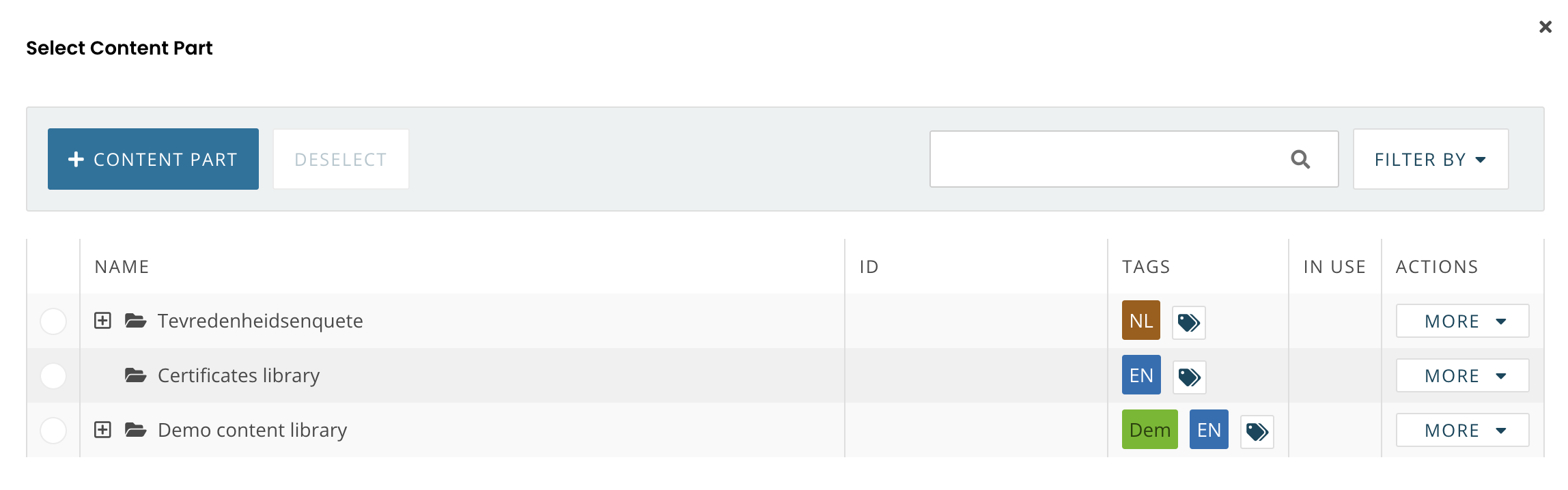 Content libraries, content parts and questions can be tagged for a while already, but the tags are not always visible everywhere just yet. An example of this is when you select a content part to display above a block. In this release, we have addressed this scenario and more.