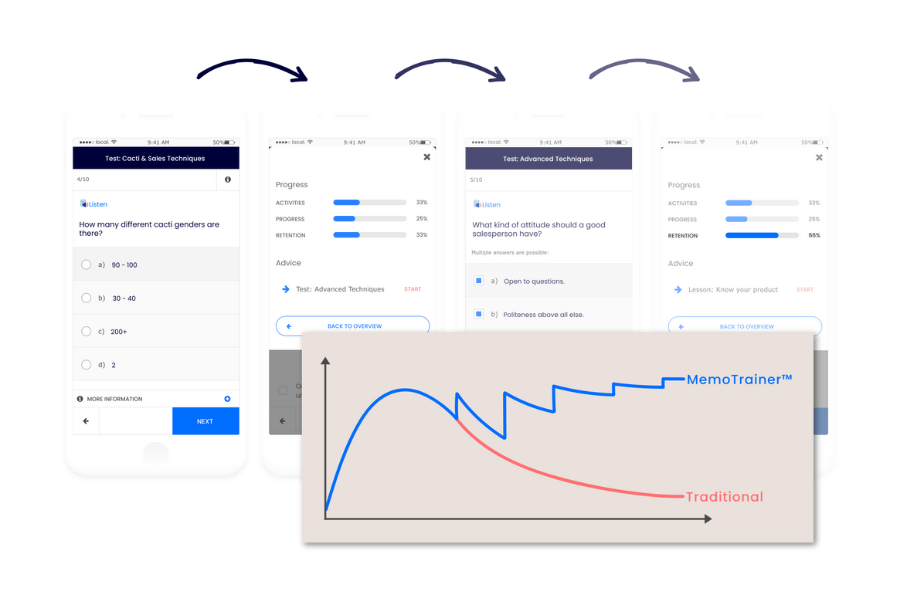 MemoTrainer™ integrates the theory of Ebbinghaus ‘retention through repetition’ in a unique way. It trains knowledge in a personalised way so learners remember more and pass their courses quicker.